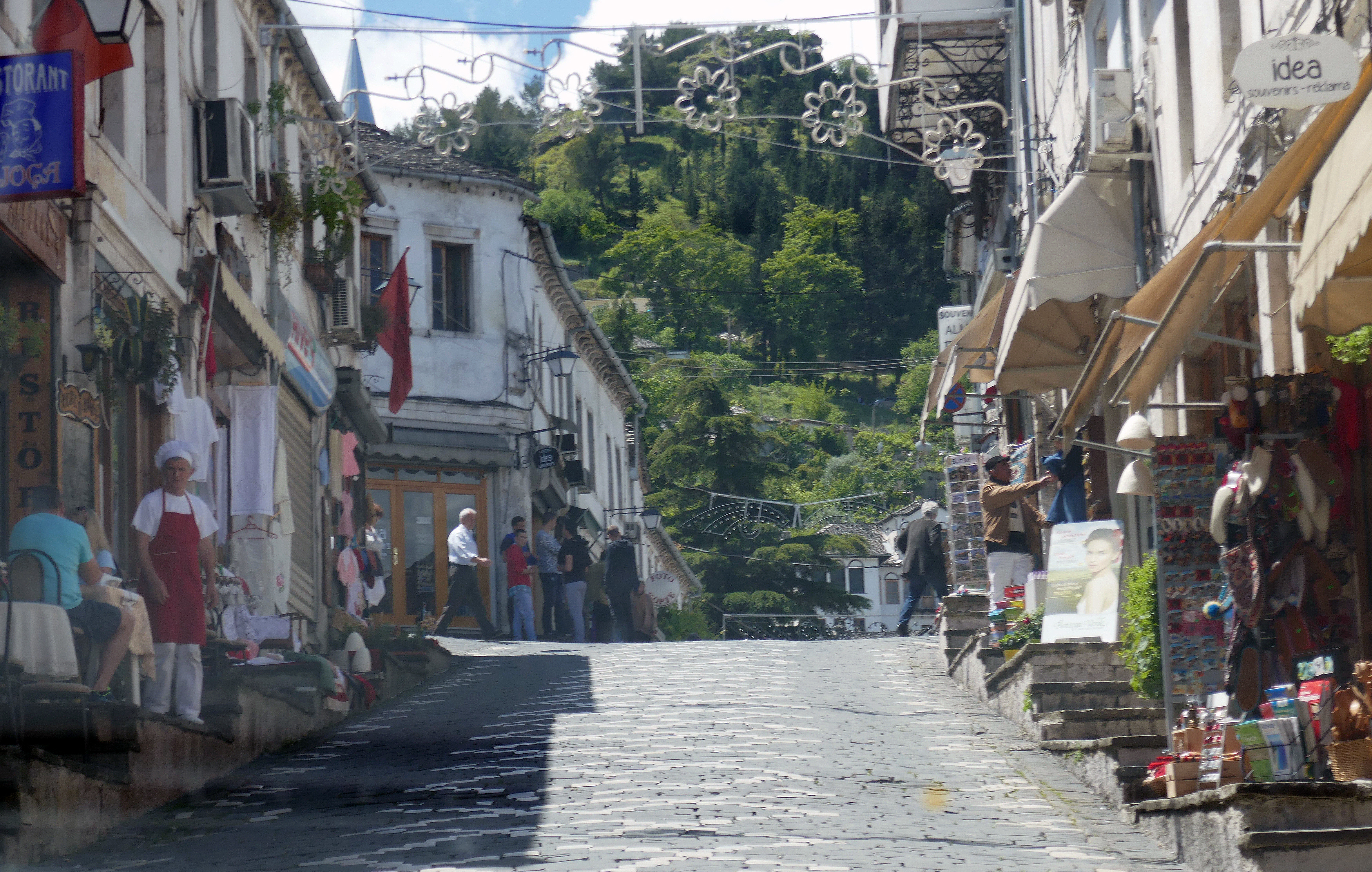 basarviertel bazar district city made of stone enver hoxha geschäfte shops gjirokastr ismail kadare menschen people museumsstadt city of museum restaurant souvenirs stadt aus stein touristen tourists unesco weltkulturerbe world heritage