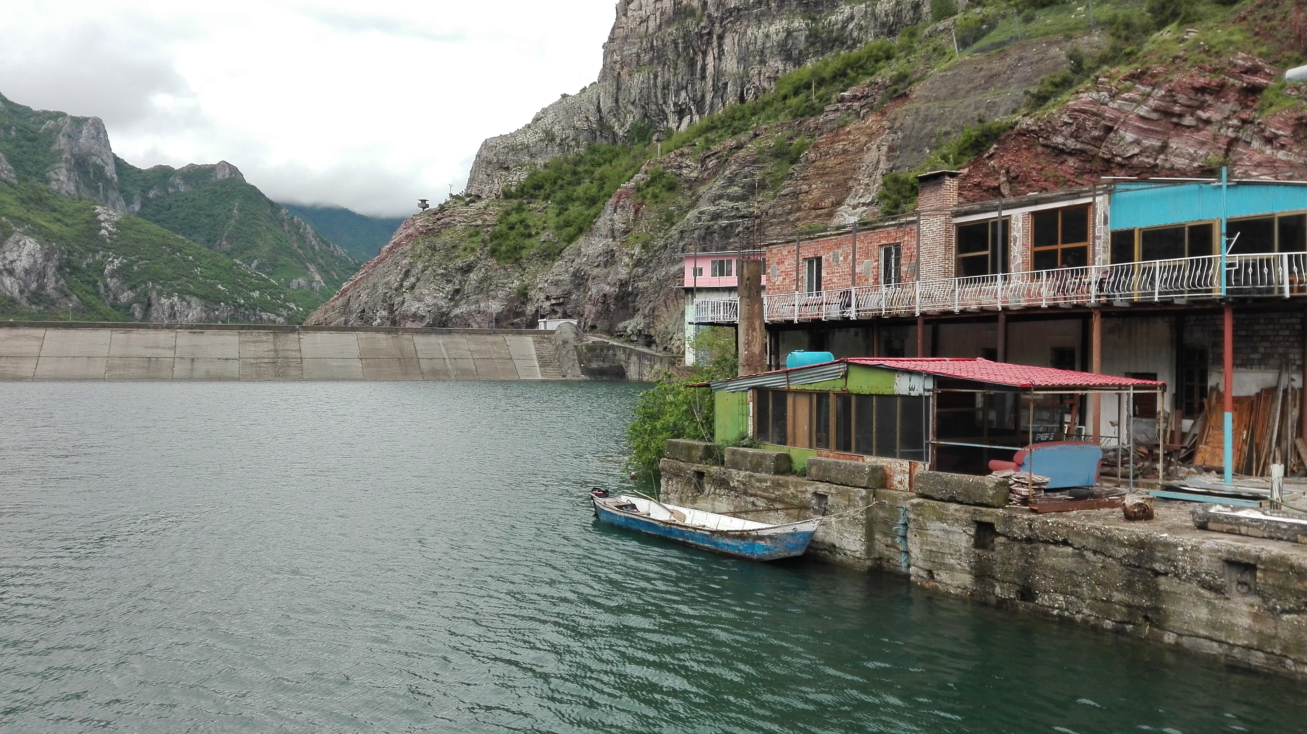 berge mountains boot boat dach roof geländer railing koman see lake landschaft landscape ruderboot rowing boat stausee artificial lake vegetation veranda wasser water