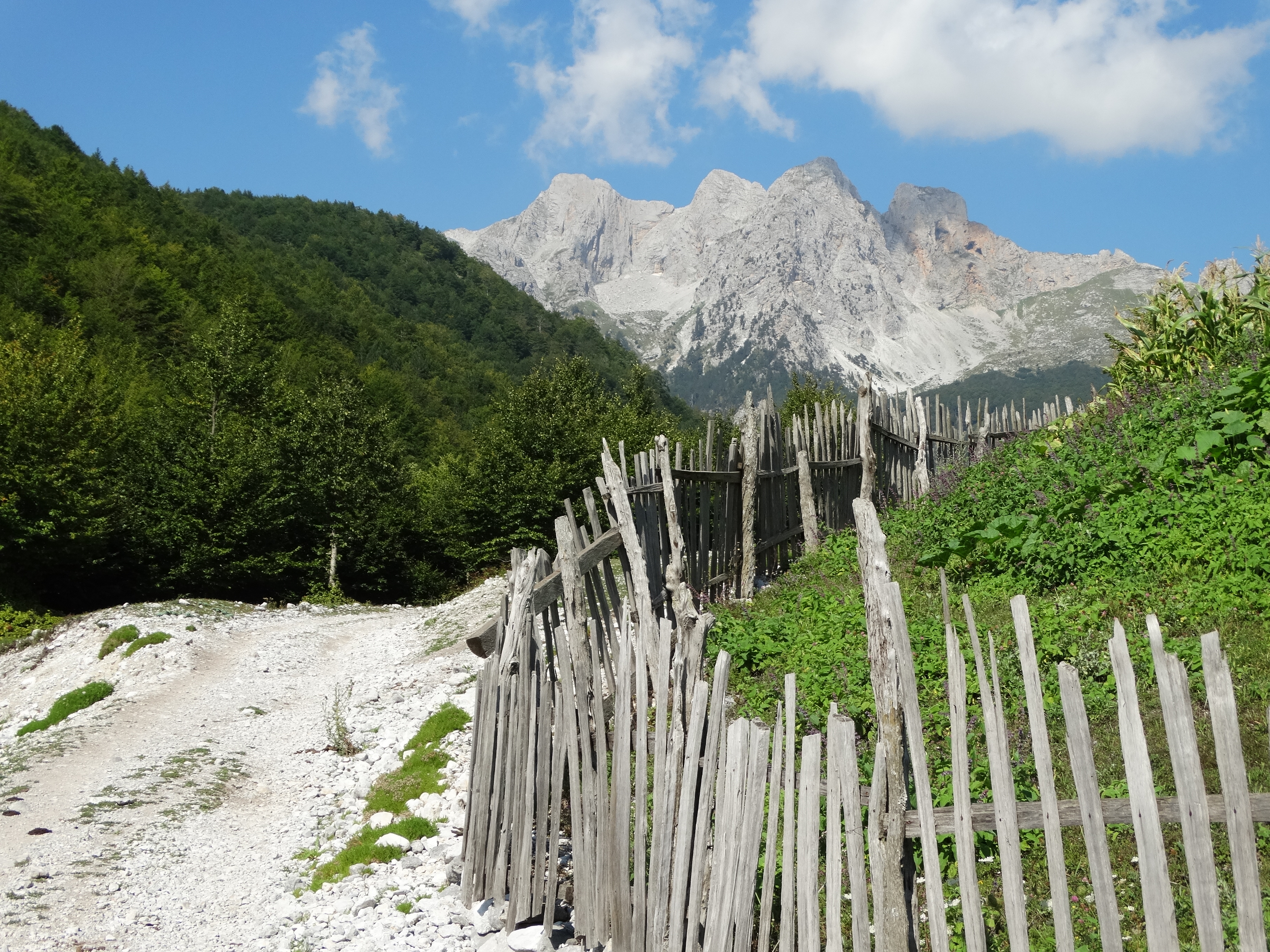 albanische alpen albanian alps bäume trees berge mountains landschaft landscape natur pflanzen plants vegetation wolken clouds zaun fence